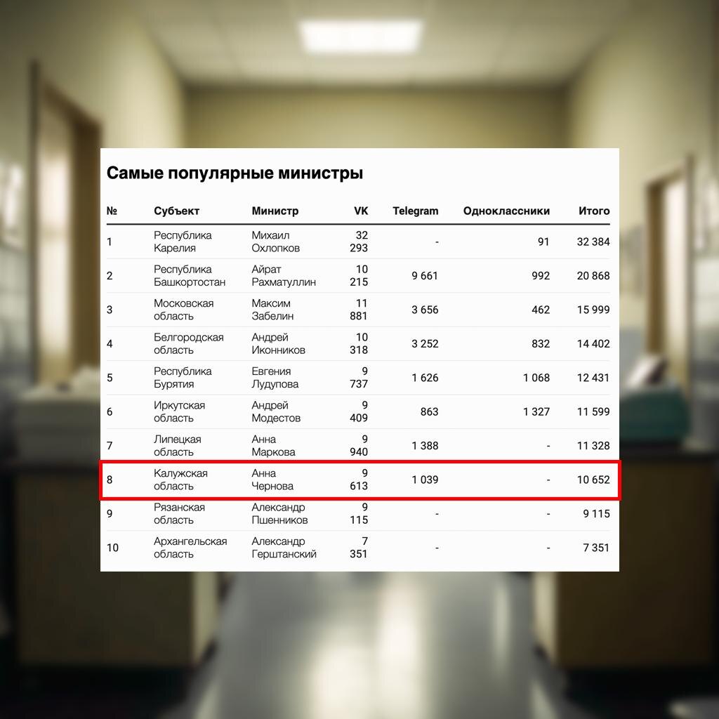 😮 Калужский министр здравоохранения попала в Forbes Аналитики для журнала провели исследование эффективности ведения социальных сетей региональными органами исполнительной власти в сфере здравоохранения. 🔵 Анна Чернова заняла 8 место по объему аудитории. На момент экспертного анализа у нее было в сумме 10 652 подписчика в соцсетях. Специалисты выяснили, что в стране всего 47 персональных страниц руководителей министерств здравоохранения в «ВК», 35 — в «Telegram» и 15 — «ОК». «В условиях цифровизации государственных услуг и роста популярности социальных сетей эффективность онлайн-коммуникаций органов власти в сфере здравоохранения напрямую влияет на доверие граждан к системе здравоохранения и качество взаимодействия пациентов с медицинскими организациями», — отметила гендиректор аналитического агентства Дарья Шубина. 👍 Анна в соцсетях регулярно отчитывается о своей деятельности и об успехах в сфере здравоохранения в регионе, а также делится важной информацией. 🤖 Прислать новост