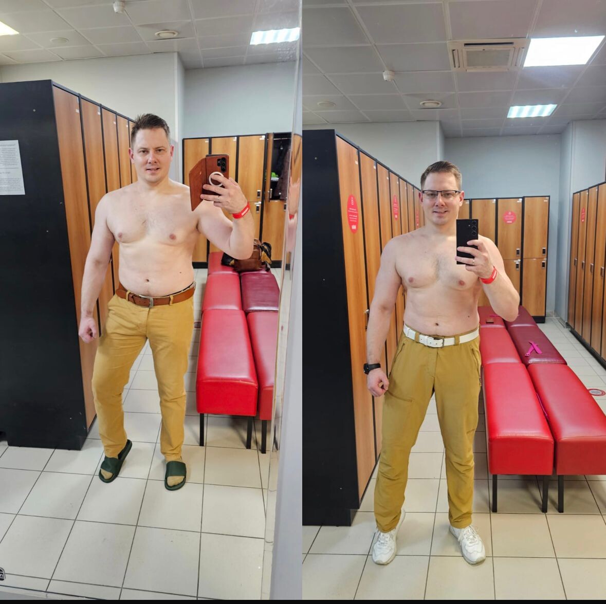 Было 104 кг. Стало 97 кг. Рост 180 см. 39 лет. Про объемы он изложил в отчете. По себе знаю, для мужика влезть в штаны, в которые долго не влазил - это лучший результат😂