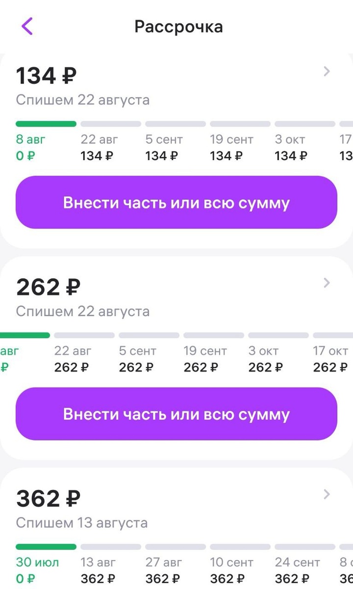 Я оформила заказ на 673 рубля, не заметила, что тумблер "оплатить частями" сдвинут на активность, товар сходила забрала, все хорошо. Вместе с ним еще был заказ, я не заметила, что 673 рубля не списалось с карты. Зашла в приложение посчитать сколько у меня осталось там платить рассрочек и вижу, что какие-то платежи по 137 рублей новые появились. Захожу, а это товар в рассрочку взят, всего заплатить мне надо будет 808 рублей. Написала в поддержку, что хочу погасить заранее, чтобы пересчитали сумму процентов или как в этой конторе они называют эти конские надбавки, но ... нет. Никакого пересчета при досрочном погашении там нет.