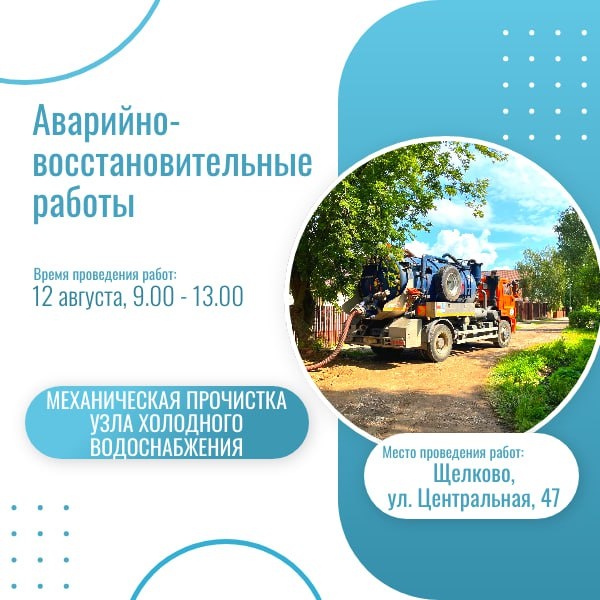 В связи с проведением работ по механической прочистке узла ХВС в водопроводном колодце (г. Щелково, ул. Центральная, д. 47), будет отключено холодное водоснабжение 12 августа, с 9:00 до 13:00