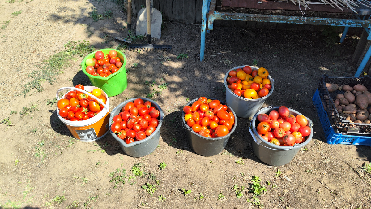 В выходные было гораздо прохладнее, немного выдохнули. 27-29 со знаком +. По нашим меркам, в параметрах этого лета, температура ниже среднего. Томатный урожай вышел на пик!! Сколько собрали, точно не скажу, на вскидку вёдер 20. Ну с ведро наверное отправилось соседским курам на корм. Это нормально. В промежутках между сбором томатов копали картошку. Ещё одни выходные и одна делянка будет убрана. Как и прошлом году, ближе к краю участка картофель хуже, чем в начале. Там когда то, много лет назад грунт насыпали, была балка. На следующий год картофель там точно не будем сажать. Ну и попытаемся удобрить эту часть огорода. Арбузы вес набирают, дыни за ними. Ну конечно же гвоздем программы все же томаты!! Это их пора. Продолжим о них. Томаты у нас разные, всего высаживали около 20- ти видов. И сортовые и гибриды. Провел небольшой анализ. Как правило, много томатов мы высаживаем ради эксперимента. Какие то, уже проверенные, те которые нас радовали ранее урожаем. Среди таких сортов , сорт Х