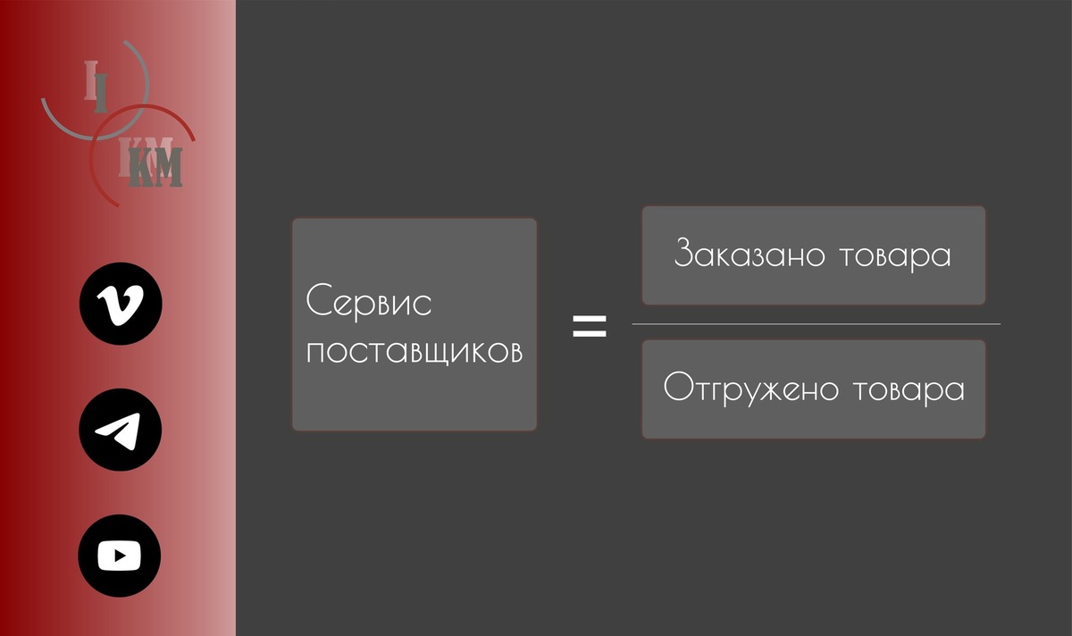 Сервис поставщика: что это такое и зачем он нужен? Сервис поставщика — показатель, который отражает, как поставщик выполняет заказы клиента (торговой сети). Чем выше уровень сервиса поставщика, тем выше продажи торговой сети. Это означает, что при правильном расчете заказа и высоком уровне сервиса поставщика торговая сеть обеспечивает наличие товара на полках. Высоким показателем считается 95%. Допустимым – 90%. Показатель ниже 90% - требуется проведение переговоров и изменение ситуации. Пример: Торговая сеть заказа 1000 товарных позиций в количестве 2567 штук. Поставщик привез 998 товарных позиций в количестве 2467 штук. Уровень сервиса = 2467 / 2567 = 96%. #метрики