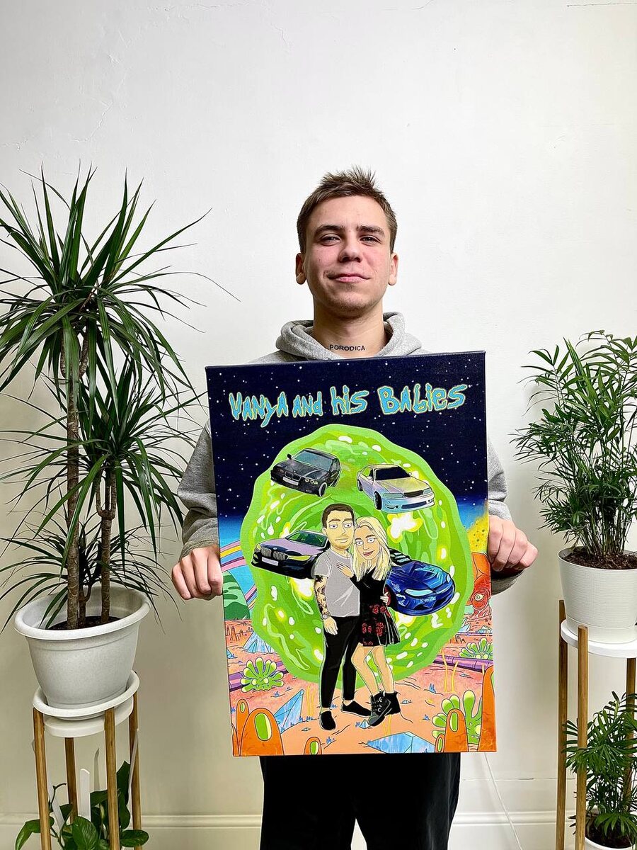 🛸 Портрет по мотивам «Рика и Морти», но сюжет — ваш собственный Что получится, если соединить любовь, немного безумия, 4 крутые тачки и мультвселенную «Рика и Морти»? Получится вот такой яркий и абсолютно персональный арт 😎 🎨 Всё нарисовано вручную: от портрета пары до каждого отражения на капотах. Такой холст не просто поднимает настроение — он буквально рассказывает историю владельца. 📸 Нужно только ваше фото и пара идей. Хотите шлем космонавта, кота на плече или штук 5 любимых машин? Сделаем. У нас тут свои порталы 🔥 📩 Пишите в @ZakazMnogoholstov — нарисуем вас в любимой вселенной. Или в своей собственной 🪐 ⸻ 💡 Интересный факт: Мультпортреты в стиле «Рика и Морти» особенно популярны у пар — потому что юмор, абсурд и любовь прекрасно сочетаются на холсте. Особенно если рядом чёрная дыра и пару спорткаров 😅