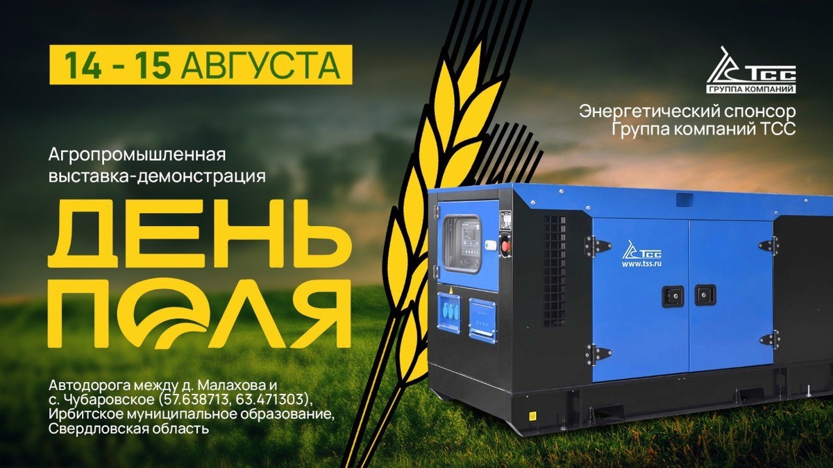Дизельные электростанции ТСС - идеально для выездных мероприятий 💡 14-15 августа 2025 года в Свердловской области пройдет выставка «День поля 2025». Энергетическим спонсором этого мероприятиям станет ГК ТСС, где от нашего генератора мы запитаем целую выставку! Во время этого мероприятия мы проведем областное семинар-совещание, на котором ГК ТСС совместно с нашим партнером ОТТО Групп представит передовые решения для энергоснабжения сельскохозяйственных предприятий. Вы сможете узнать, как обеспечить выгодную работу агрохозяйства с помощью надежных и эффективных дизельных электростанций от ГК ТСС. Мероприятие организовано Министерством агропромышленного комплекса и потребительского рынка Свердловской области. 🗺️ Ждем вас: Колхоз «Урал» (автодорога между д. Малахова и с. Чубаровское (57.638713, 63.471303)), Ирбитское муниципальное образование. ❗ВАЖНО : Для посещения мероприятия необходима предварительная регистрация! Готовы обсудить ваш проект? Свяжитесь с нами для получения консультаци