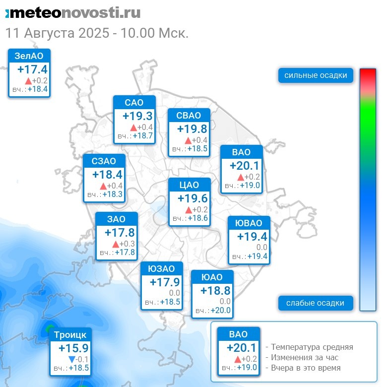 В 10:00 в Москве было от +15°C до +20.6°C, средняя температура +18.8°C #погода #Москва #лето #температура #11августа #понедельник