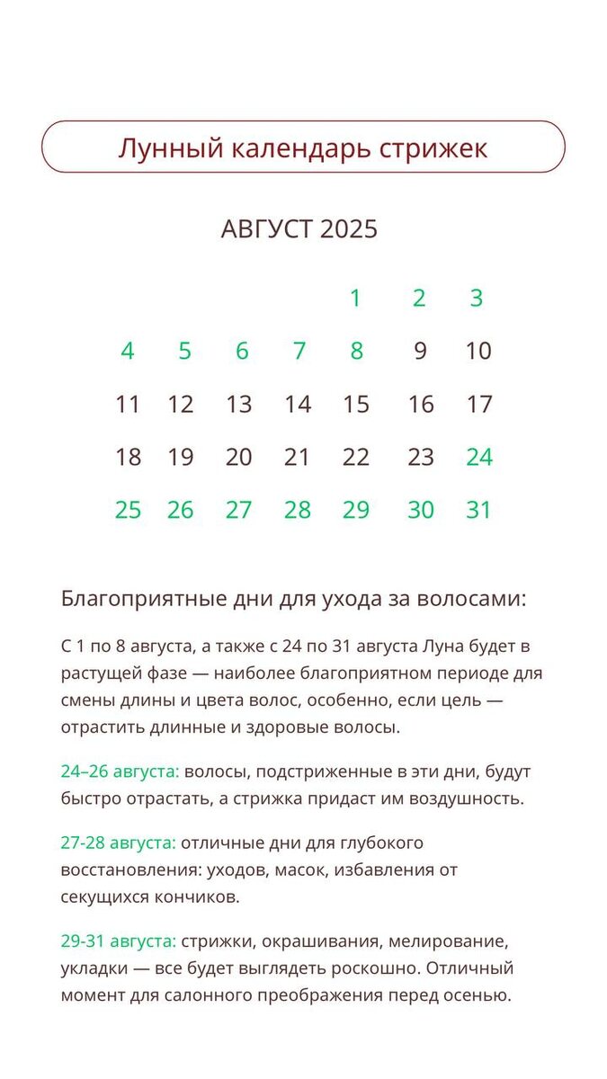 🌕 Лунный календарь ухода за волосами на август 2025 Благоприятные дни для стрижек и окрашиваний: растущая Луна С 1 по 8 августа, а также с 24 по 31 августа Луна будет в растущей фазе — наиболее благоприятном периоде для смены длины и цвета волос, особенно, если цель — отрастить длинные и здоровые волосы. ⭕️24–26 августа: растущая Луна возвращается, а вместе с ней — легкость и игривость. Стрижка в эти дни придаст волосам воздушность, подвижность, и ты сама почувствуешь это в теле. Волосы, подстриженные в эти дни, будут отрастать быстро — идеальный вариант, если хочешь часто менять образ. ⭕️27–28 августа: отличные дни для глубокого восстановления: уходов, масок, избавления от секущихся кончиков. Можно освежить форму, не меняя длину, волосы будут расти крепкими и блестящими. ⭕️29–31 августа: стрижки, окрашивания, мелирование, укладки — все будет выглядеть роскошно. Отличный момент для салонного преображения перед осенью. Хорошие дни для стрижек и окрашиваний: убывающая Луна Период