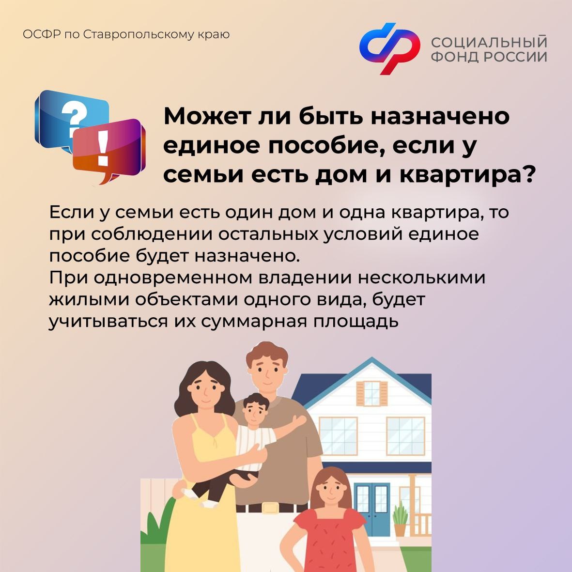 📌При назначении единого пособия Отделение СФР по Ставропольскому краю оценивает имущество семьи. Оно не должно превышать установленный перечень 🏢🏡 Какие жилые объекты семья может иметь одновременно: - Квартира. Если их несколько, суммарная площадь не более 24 кв. м на человека. - Частный дом. Если домов несколько, суммарная площадь не более 40 кв. м на человека. - Садовый дом или дача; Если у семьи есть, например, и дом, и квартира, то при соблюдении остальных условий единое пособие будет назначено. ❤️Подписывайтесь на Отделение СФР по Ставропольскому краю в Телеграм 💬, чтобы быть в курсе актуальной информации. #СФР #единоепособиесфр