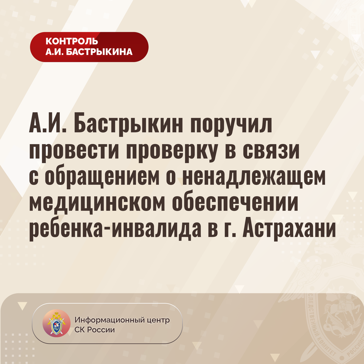 А.И. Бастрыкин поручил провести проверку в связи с обращением о ненадлежащем медицинском обеспечении ребенка-инвалида в г. Астрахани В комментариях в аккаунте приёмной Председателя СК России А.И. Бастрыкина «ВКонтакте» поступило обращение по вопросу нарушения прав ребенка, являющегося инвалидом, из города Астрахани на качественное медицинское обеспечение. В 2023 году девочке установлен медицинский прибор, эксплуатация которого возможна при наличии определенных расходных материалов к нему. Однако в текущем году компетентными органами закупка указанных медицинских изделий не осуществлена, в связи с чем в июле заявительнице было отказано в выдаче рецепта на очередное обеспечение. При этом для малолетней предложены аналоги, использование которых может привести к ухудшению состояния ее здоровья. Обращения матери в различные инстанции результатов не принесли. Председатель Следственного комитета Российской Федерации Александр Иванович Бастрыкин поручил руководителю СУ СК России по Астраханско
