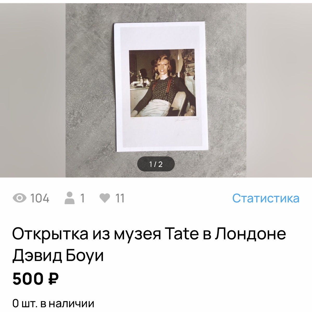 У меня из поездки в Лондон осталось две одинаковых открытки из музея современного искусства Tate с Дэвидом Боуи. Покупала одну себе, вторую хотела подарить, но так и не сложилось. Покупала я их по фунта 1,5, вряд ли больше. Но раз уж теперь смотаться в Лондон на уик-энд и прикупить открыточек стало сильно сложнее, то и цену я решила поставить побольше. Ну, знаете, из серии: купят - хорошо, а нет, так нет.🤷🏻♀️