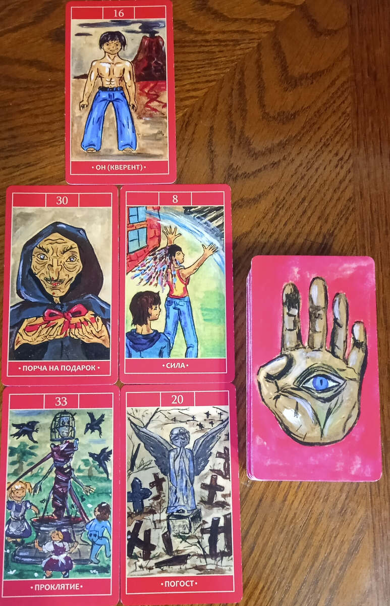 Вышли карты: "Порча на подарок", "Сила", "Проклятие", "Погост". Рассмотрим как эти воздействия сказываются на жизни Вашего врага. "Порча на подарок" - на Вашего врага навели порчу, его враги, чтобы доставить ему неприятности, эта порча наведена на подарок, который ему подарили его знакомые, которые вхожи к нему в дом, так же могут сделать подарок - порчу, конкуренты на работе, в любом случае эту порчу наводят из-за злобы и ненависти. Какие последствия от этой порчи получил Ваш враг? В любви: подарок может разлучить влюблённых. В партнёрстве и семье: прекращаются все договорные отношения, на финансовом плане отток денег. Постоянные долги, рвутся дружеские связи, если Ваш враг женат - его не выносит супруга, а он её. В здоровье: ужасающая усталость, ранее старение, болезни. "Сила" так как рядом с этой картой вышли негативные карты, то и значение карты будет не самое хорошее. Это говорит, что у Вашего врага отсутствует сила, рассмотрим к чему это его приводит? 1. Ему сложно сопротивлятьс