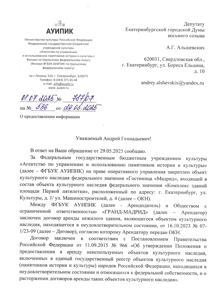 Знаковое для города здание, достопримечательность федерального уровня, разрушается на наших глазах. Вдобавок неделю назад оно в очередной раз горело. Запрашивал у Агентства по управлению и использованию памятников, что предпринимается для спасения бывшей гостиницы. Как следует из ответа, пару лет назад объект культурного наследия сдали в аренду ООО «Гранд-Мадрид». Фирма должна до середины октября 2025 года подготовить и согласовать проектную документацию, положенную для работ. После чего у нее будет еще пять лет на ремонт, реставрацию. Вот только, по информации госучреждения месячной давности, коммерсанты не спешат выполнять свои обязательства.