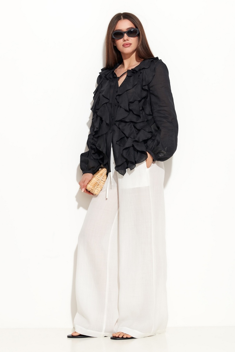 Блуза полуприлегающего силуэта, длиной до середины линии бедер. Вырез горловины округлый. Блуза застегивается на пуговицы в цвет изделия. Воротник обрамлен воланом. Передняя часть декорирована вертикальными воланами, которые добавляют образу воздушности и романтичности. Классический крой и натуральная ткань изделия обеспечат комфорт при носке на весь день. Состав 100% рами Запросить оптовый прайс здесь!