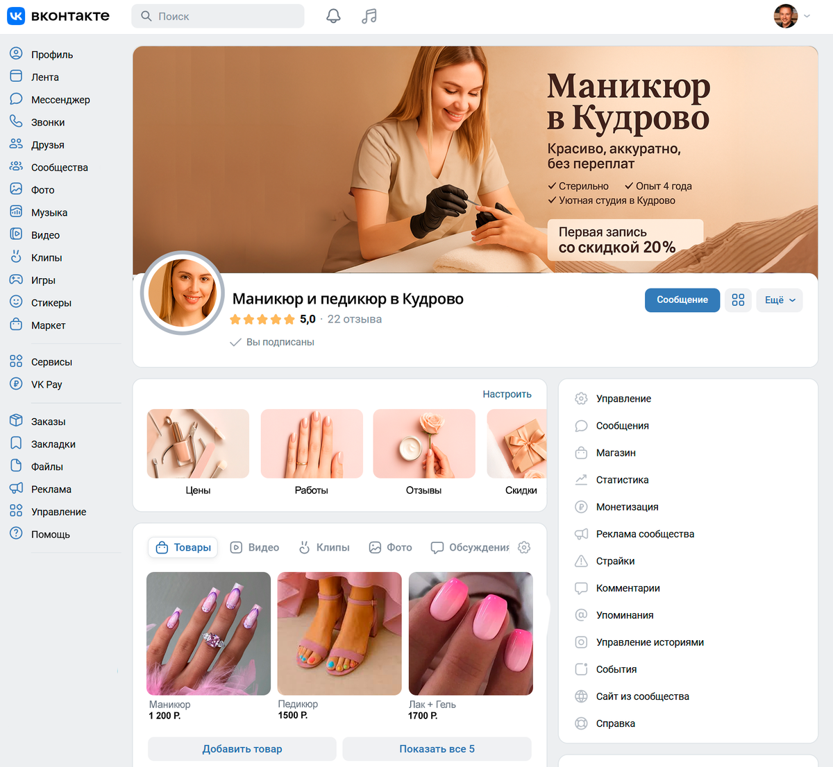 Ко мне обратилась мастерица по маникюру — работает на дому, делает аккуратно и с душой, клиенты довольны, но новых нет. ВКонтакте сообщество у неё было, но мёртвое: нет заявок, статистика сообщества в ВК — почти нулевая. Бюджет на рекламу был небольшой. Но главное — всё делать по уму. И тогда даже при минимальных вложениях можно получать стабильный поток клиентов. Первое, что я всегда делаю — это не запуск рекламы, а упаковка сообщества. Потому что как бы круто ты ни настроил таргет, если в группе бардак — заявок не будет. Мы оформили сообщество в ВК: сделали обложку с реальной работой мастера, написали на ней оффер: «Маникюр в Кудрово — аккуратно, стерильно, уютно. Скидка 20% на первый визит». Аватар — логотип, тёплые цвета. В меню: отзывы, прайс, примеры работ, как записаться. На мобильной версии тоже всё выглядело аккуратно. Важно: закрепили пост с оффером. Это то, что сразу видит человек. Там было коротко: «Хочешь красивый маникюр без салонных цен? Пиши в сообщения сообщества. Раб