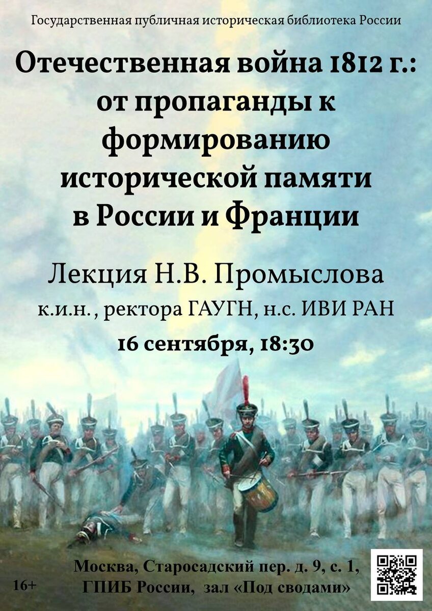 История и память о войне 1812 года 💡 16 сентября ректор ГАУГН Николай Промыслов проведёт открытую лекцию «Отечественная война 1812 года: от пропаганды к формированию исторической памяти в России и Франции». 📆 Дата и время: 16 сентября в 18:30. 📍 Место проведения: м. Китай-город. Старосадский пер. д. 9 стр. 1, зал «Под сводами» в Государственной публичной исторической библиотеке России. 🖇️ Регистрация обязательна по ссылке. 🧑🏼💻 Для дистанционных участников — ссылка на трансляцию будет отправлена на указанный при регистрации e-mail за день до лекции. #история #наука #ГАУГН #простРАНство_ГАУГН #gaugn_event