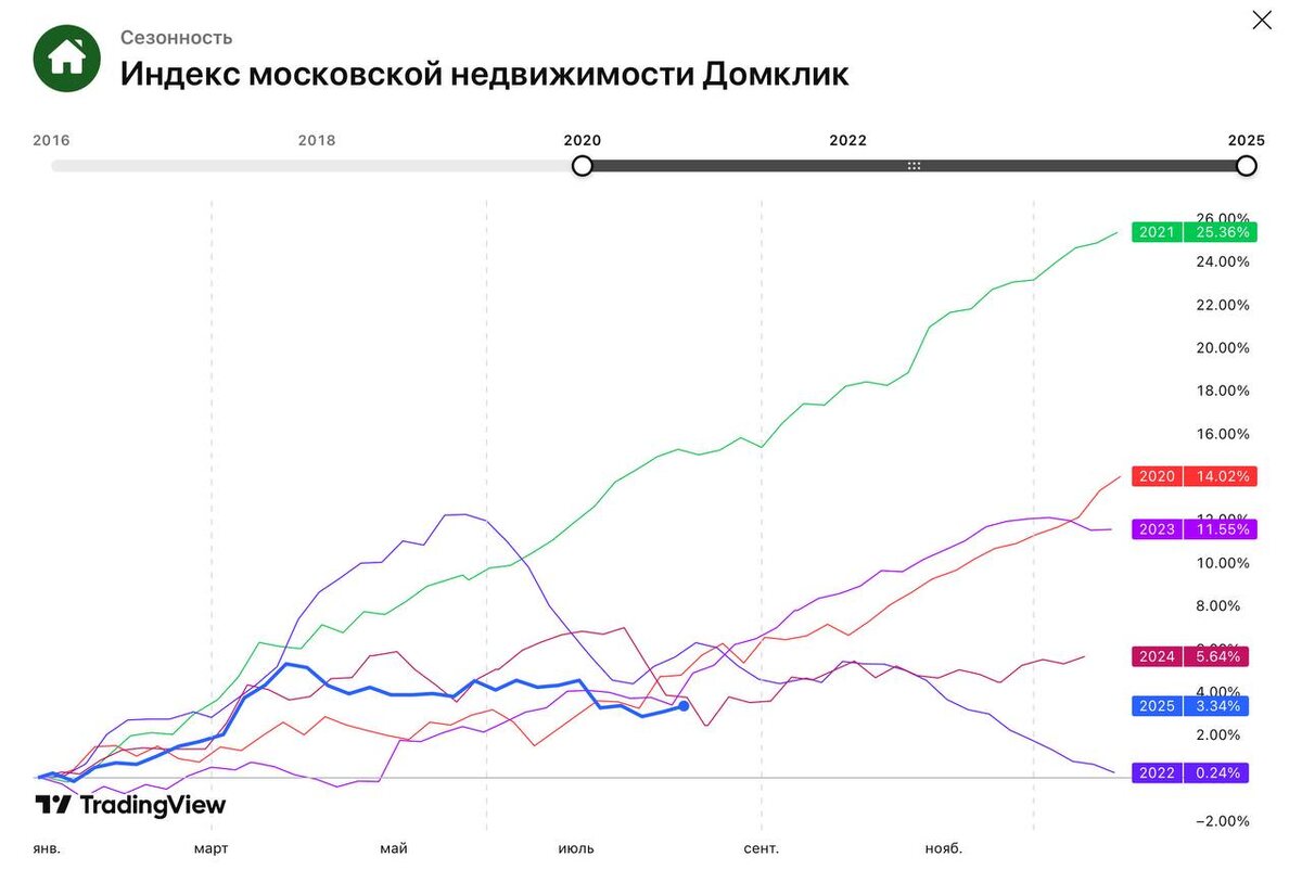 Динамика индекса московской недвижимости Домклик 📈Что ж, восходящий график 2021 навеивает ностальгию по доходности. А всплески происходят с завидной регулярностью, как и откаты. 🌆Поэтому оптимальный горизонт для недвижимости не менее 5 лет. И… точка входа все же не менее важна. @viktoriaproinvest