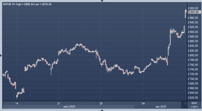 Рынок акций РФ открылся в основную сессию ростом индексов РТС и МосБиржи на 2,4% График индекса Мосбиржи интервалами в 60 минут Рынок акций Российской Федерации в начале основной сессии на Московской бирже в понедельник демонстрирует рост на фоне ожиданий встречи президентов России и США для обсуждения мирного урегулирования конфликта вокруг Украины, которая состоится 15 августа на Аляске. Кроме того, улучшение внешней фондовой конъюнктуры также способствует росту рынка. Однако сдерживающим фактором для покупателей является снижение цен на нефть: фьючерс на Brent опустился ниже отметки в 66 долларов за баррель. Индексы Московской биржи и РТС за первую минуту торгов выросли на 2,4%. Лидерами роста стали акции компаний «Юнипро» (+9,8%), «Эн+ груп» (+5,9%) и ОК «Русал» (+5,4%). Президент США Дональд Трамп сообщил в пятницу вечером, что встреча с президентом России Владимиром Путиным состоится 15 августа на Аляске. «Встреча, которую все так ждут, между мной, президентом Соединённых Штатов,