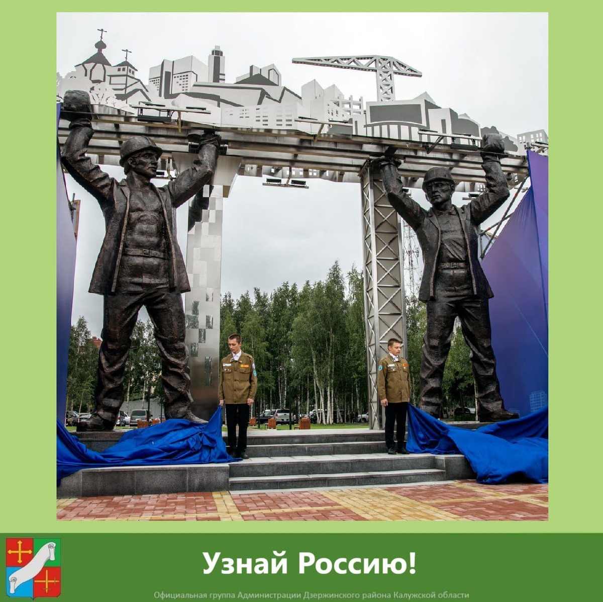 С вами наша постоянная рубрика "Узнай Россию!" На предыдущий вопрос практически все ответили правильно. Это Калуга. А теперь новое задание! Накануне Дня строителя открыли монумент, который уже привлек внимание горожан. Он представляет собой уникальную композицию: две скульптуры, символизирующие рабочих, держат на ладонях землю с городом. Проект уникален, как по замыслу, так и по исполнению. Скульптуры изготовлены из бронзы, а макет города, который они держат, — из металла. Образ строителя собирательный, не привязанный к конкретной сфере.
