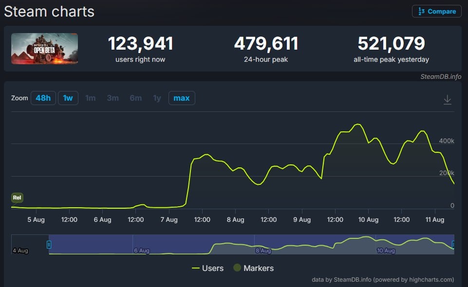 Пиковый онлайн беты Battlefield 6 достиг 521 тысячи игроков. Первый этап бета-тестирования уже подошёл к концу. Второй начнётся с 14 по 17 августа. По итогу это самая масштабная бета за всю историю серии, о чём сообщили в EA. #игры@InYouEyes