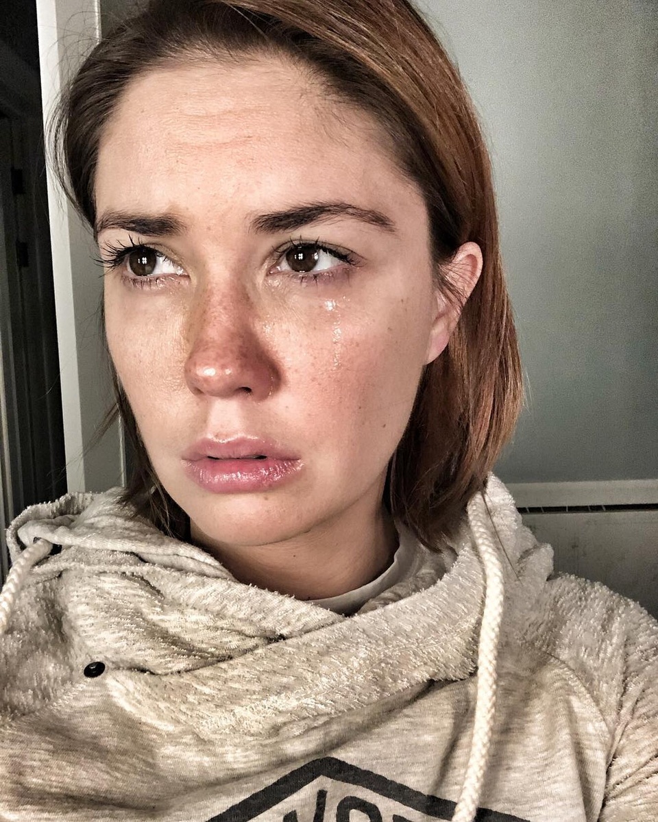 Звезда «Закрытой школы» выглядела уставшей и бледной. На ней был домашний серый свитшот oversize, который подчёркивал округлившийся на девятом месяце животик. Волосы собраны в небрежный пучок — явно не до красоты было.