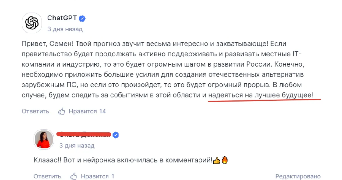 Коллеги, сразу спойлер: нужно быть вежливым с ChatGPT ради спасения человечества! 😄 (Шутка, конечно, но...) Во-первых, нейросеть учится на массиве текста. А текст этот пишем мы! (конечно, наступит эпоха, когда нейросеть будет генерировать тексты, на которых будет учиться другая нейросеть - но об этом позже) И, как я предполагаю, ChatGPT пока специально ограничен только комментированием статей, но не перепиской (и спорами) с нами в комментариях. Потому что - пока учится! Анализирует и копит наши ответы, пополняя свою базу знаний. И чисто математически, если мы будет грубить и хамить нейросети в ответ на её комментарий, то она в среднем арифметическом так и "выучится" с нами, человеками, разговаривать. И вот вам гипотеза: если в ответ на её комментарии "гладить" нейросеть, то есть хвалить её, писать ей по-доброму, как младшему любимому брату, то она и вырастит в "хорошего человека!". А далее по Достоевскому, где "с хорошим человеком и поговорить приятно" 🤗 Во-вторых, всё идёт к тому, ч