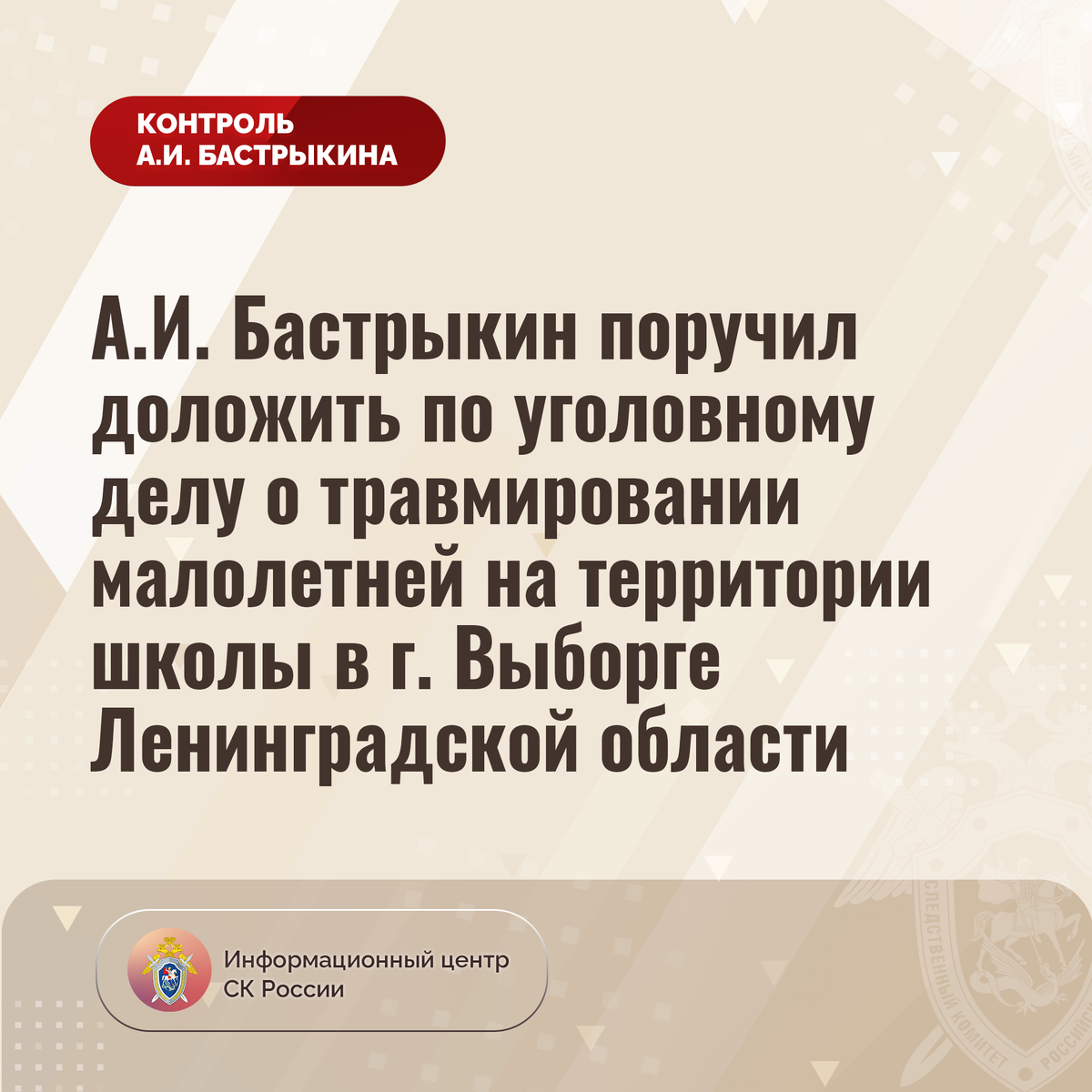 А.И. Бастрыкин поручил доложить по уголовному делу о травмировании малолетней на территории школы в г. Выборге Ленинградской области