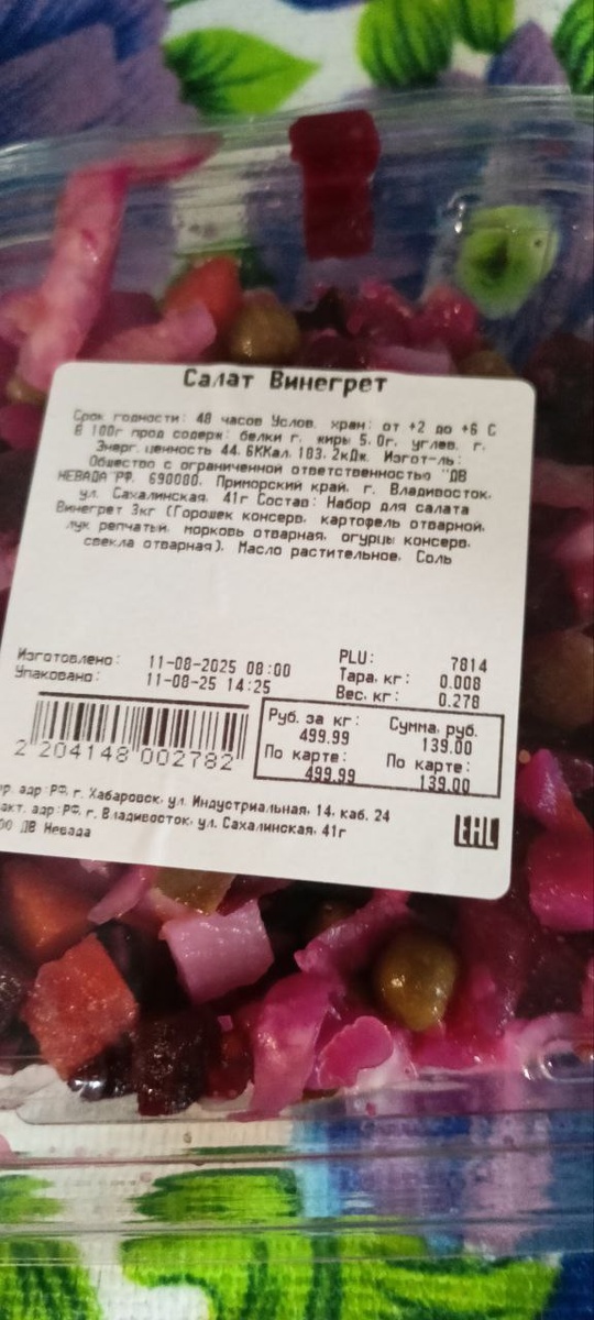 Уважаемые Тихинцы, сегодня купила в Самбери на Тихой винегрет, сразу пришла домой,но есть его не возможно,он прокисший и воняет,нести обратно уже нет сил,выкинула деньги,поэтому проверяйте салаты и еду сразу