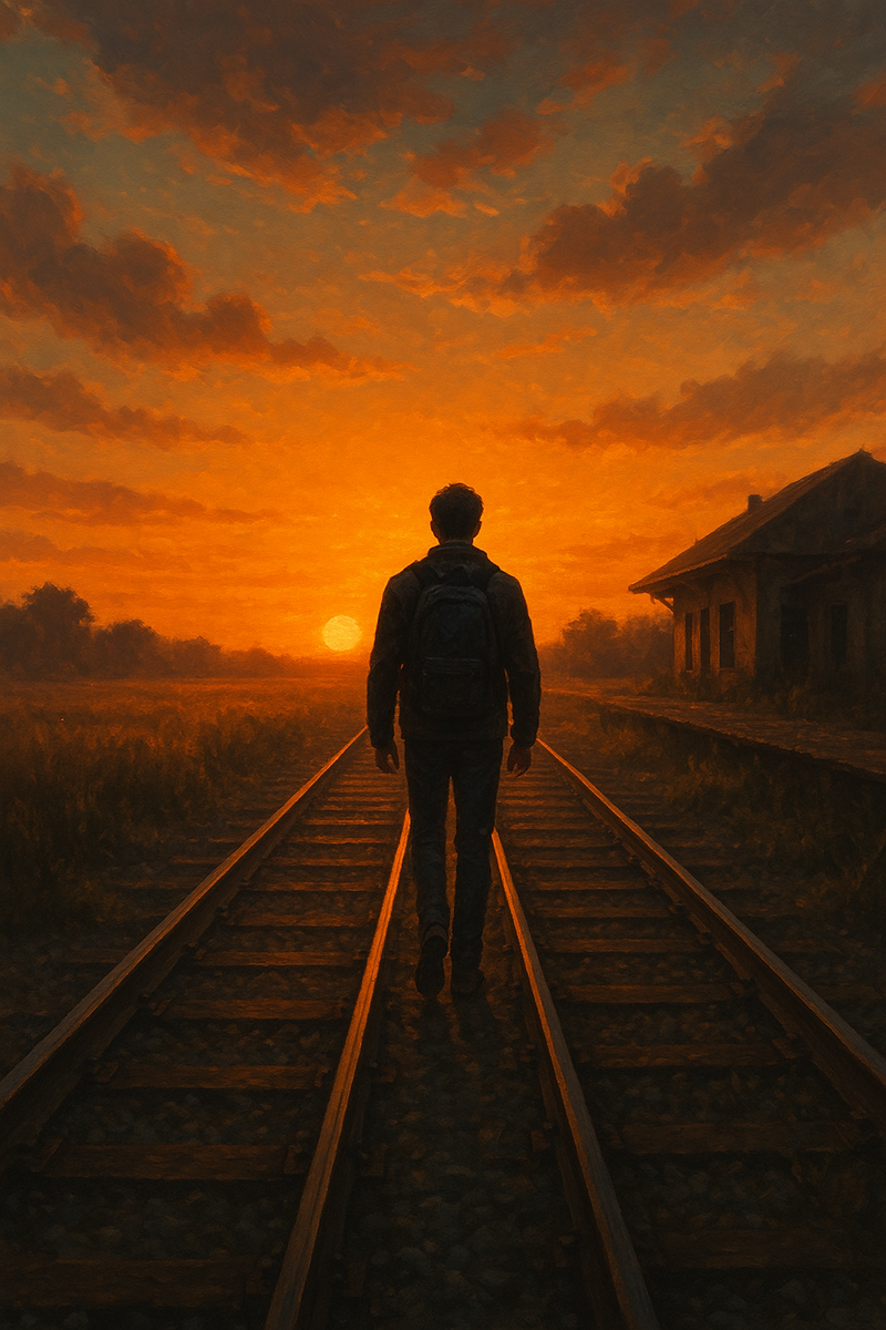 Парень шел вдоль железнодорожных путей. Гравий тихо похрустывал под подошвами, будто вымерял ритм его шагов. Слева, за полосой заросшей травы, тянулось поле — блеклое, выгоревшее под долгим летним солнцем. Справа — вечный силуэт рельс, уходящий в глубь заката. Эти две линии — стальная и солнечная — будто сговорились: одна уводила его вперед, другая растворялась в оранжевом мареве, обещая что-то неясное за горизонтом. Мысли приходили без спроса. Сначала просто о том, что закат вечно красив одинаково — и в пятнадцать, и в двадцать девять. Потом — о том, как странно, что жизнь вмещает в себя целые эпохи, разделенные такими четкими границами, что кажется: это были жизни разных людей.