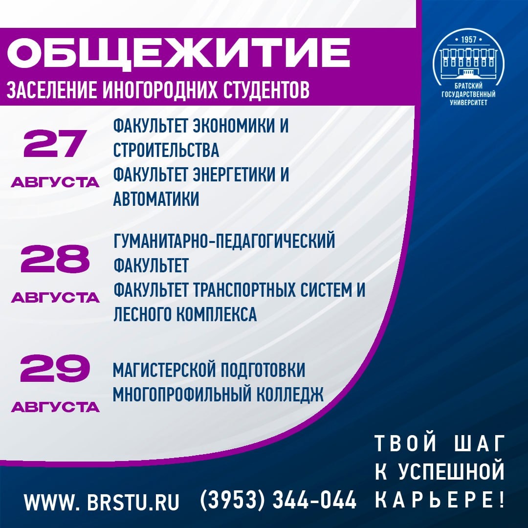 Пришло время начинать настоящую студенческую жизнь! 🎓 Начнем с заселения в Общежитие 🏢 Для каждого факультета выделена определенная дата❗️ При себе иметь: 1. Паспорт (без выписки с места регистрации). 2. Две фотографии (2х3 см). 3. Документы, подтверждающие статус льготника (оригинал + копия). 4. Авторучка для заполнения документов. 5. Постельное белье – 2 комплекта. ⚠️Строго запрещено ввозить электрообогреватели, микроволновые печи, электрические чайники мощностью более 1,5 кВт, электроплитки, мультиварки, домашних животных. 📍Заселение будет проходить по адресу: ул. Солнечная, 19 (общежитие № 4), кабинет 118. 📅График работы: среда – пятница с 08.00 до 16.12, обед с 12.00 до 13.00. Стоимость проживания в общежитии для студентов очной формы обучения: 📝2-х местная комната – 1001 руб. 00 коп. 📝3-х местная комната – 972 руб. 00 коп. Заселение несовершеннолетних студентов производится только в присутствии родителей или законных представителей. #первокурснику
