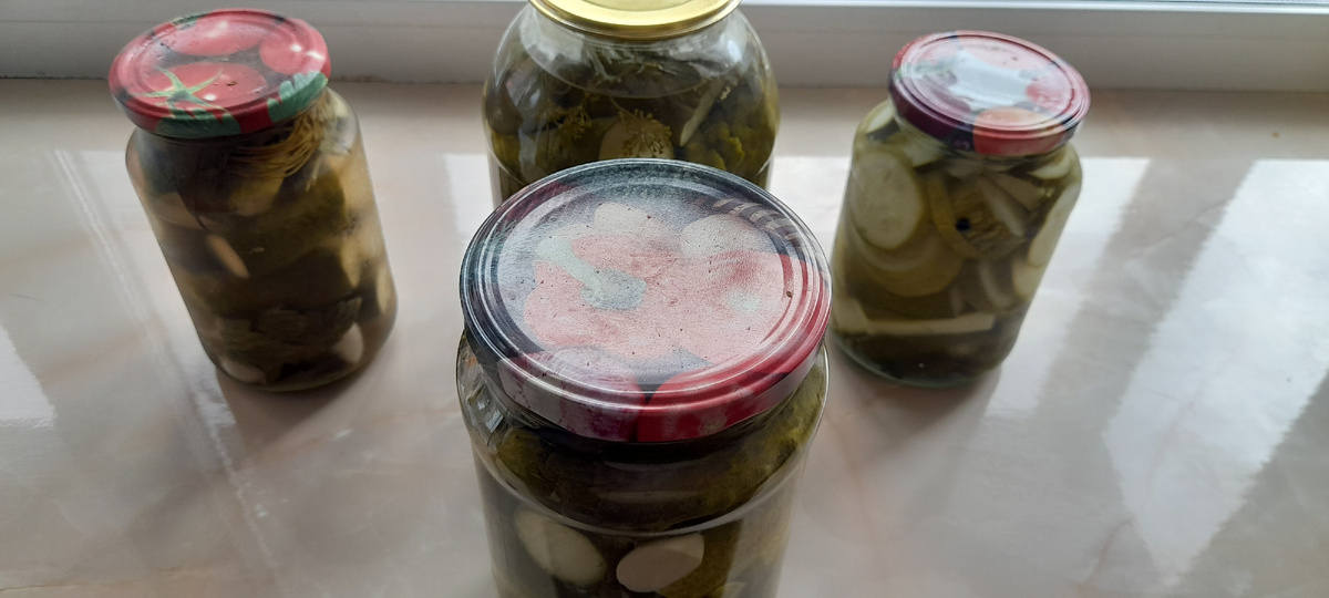 Всех приветствую на моём канале, сегодня я вам расскажу как консервировать кабачки и огурцы. Начну свой путь приготовления с огурцов. Огурцы я высаживаю в грунт пророщенными семенами, под временное укрытие, беру два сорта "Зятёк" и "Гармонист". На уличе начинаю собирать с середины июля и консервирую. Способ приготовления консервированных огурцов: 1) Собранные огурцы тщательно помыть. После этого все промытые огурцы кладу в таз с холодной проточной водой на 4-6 часов. Это делаю для того,чтобы огурцы впитали в себя немного воды, так как огурцы будут более хрустящие при заливке рассола и в огурцах не будет пустот при консервировании. 2) А пока готовим все для заливки рассола: на литровую банку беру зубок очищенного чеснока, один,два лавровых листа, 5-8 горошков черного перца, 2-3 листа черной смородины, один лист вишни, укроп-зонтики (на ваш вкус), один лист хрена или половину если он большой, 1-2 веточки иссопа. Все пряности кладем на дно банки, и оставляем еще, что бы доложить на верх