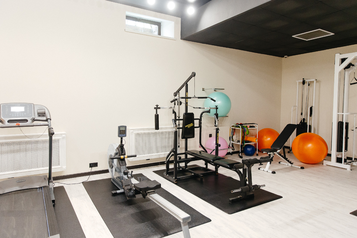 - Современное оборудование: Просторный и светлый зал ЛФК оснащен современными тренажерами для кардио- и силовой нагрузки (беговая дорожка, эллиптический и гребной тренажеры, многофункциональные силовые установки), а также широким спектром инвентаря для индивидуальных занятий (мячи, коврики, эспандеры, установка Ski Machines).