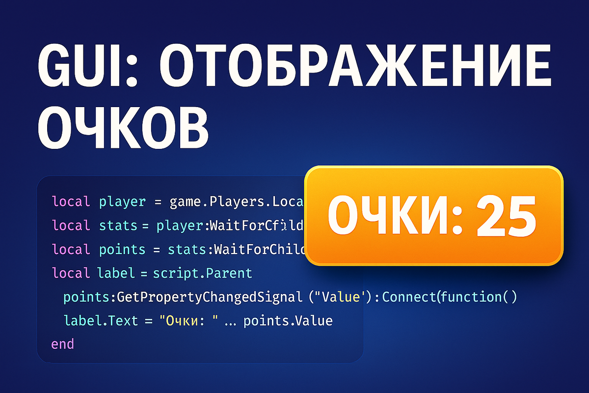 После того как ты научился начислять очки, следующим шагом становится их отображение на экране — чтобы игрок видел свой результат в реальном времени. Это не только полезно, но и добавляет вовлечённости в игру. Для этого используется GUI — графический интерфейс (Graphical User Interface). В Roblox он позволяет создавать панели, кнопки, текст и другие элементы, которые видны игроку. Внутри TextLabel создай LocalScript и вставь: Важно: этот код работает только в LocalScript, потому что он обращается к LocalPlayer. Не пиши его в обычный Script — он просто не сработает. 📘 Официальная документация Roblox по GUI (англ.) 📘 Система leaderstats в Roblox 🎥 Видеоурок на YouTube (на русском) — как создать GUI и связать его с очками 🧩 GUI редактор: стили, якоря и позиционирование Теперь ты умеешь не просто начислять очки, но и красиво их показывать игроку. Это фундамент для создания полноценного интерфейса: магазинов, панелей миссий, уровней и многого другого. #roblox #lua 💬Telegram | 📹YouTube