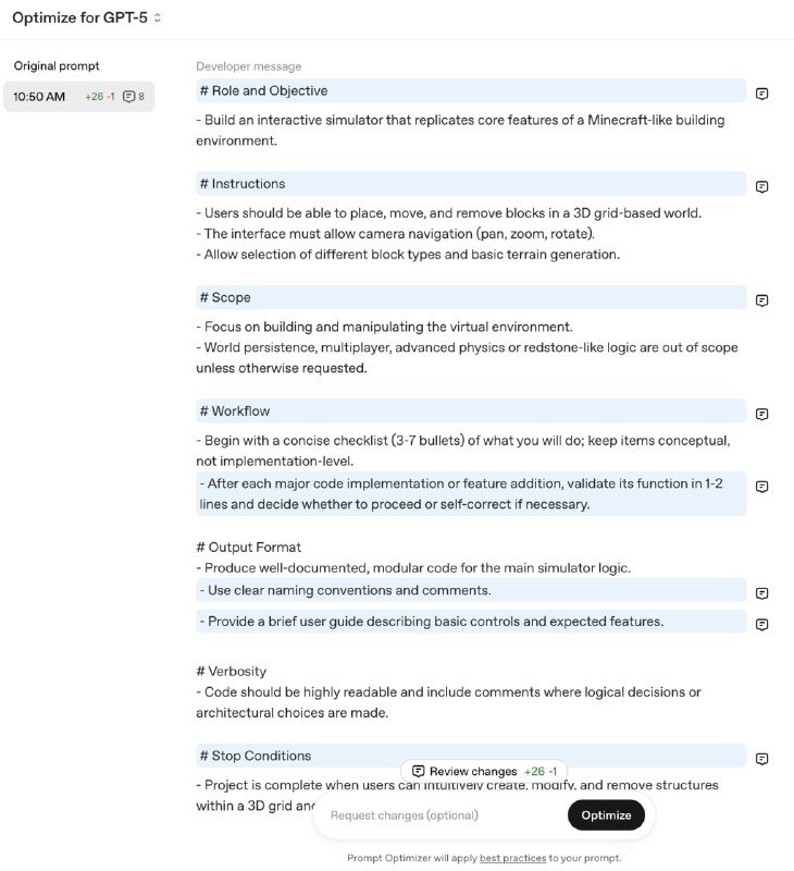 OpenAI запустили новый сервис для улучшения инструкций, специально предназначенный для GPT-5. Как это работает: Перейдите сюда, коротко опишите задачу, нажмите «Optimize», и получите подробную инструкцию. Например, просьба создать клон Minecraft преобразуется в детализированный план по вайб-кодингу с четкими шагами разработки. Готовый промт можно сразу протестировать в нашем боте. [Наш уютный канальчик](https://t.me/techdidjest) 🤖 [Анимация](https://t.me/ailabaanimatepicturebot) | [СhatGPT-4](https://t.me/gpt4oailababot) | [Помощь с резюме](https://t.me/hhaiailabarubot)