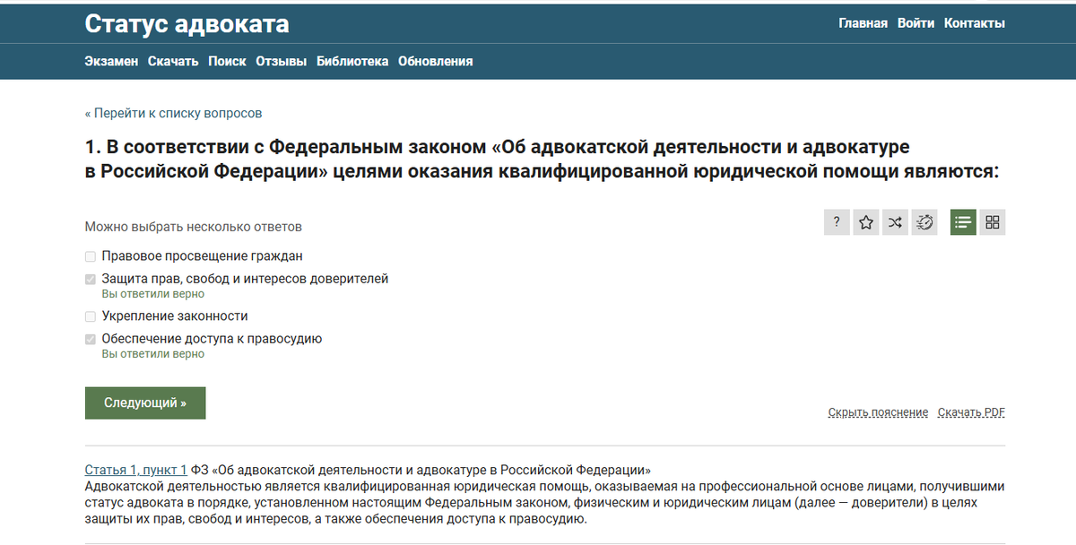 1. В соответствии с Федеральным законом «Об адвокатской деятельности и адвокатуре в Российской Федерации» целями оказания квалифицированной юридической помощи являются: Можно выбрать несколько ответов ? --------- Статья 1, пункт 1 ФЗ «Об адвокатской деятельности и адвокатуре в Российской Федерации»