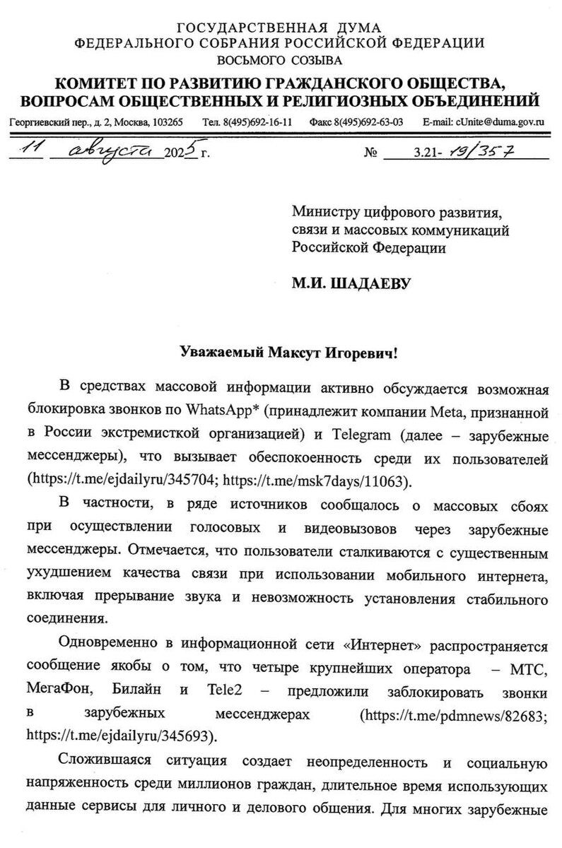 📞⚡Попросила Минцифры разъяснить ситуацию с блокировкой звонков в мессенджерах 📣В СМИ активно обсуждается возможная блокировка голосовых и видеозвонков через иностранные мессенджеры, такие как WhatsApp (принадлежит корпорации Meta, которая признана в РФ экстремистской организацией) и Telegram. Также сообщается о массовых сбоях при совершении звонков, ухудшении качества связи, прерывании звука и нестабильности соединения при использовании мобильного интернета. ❌Кроме того, в интернете распространяется информация о том, что крупнейшие операторы связи - МТС, "МегаФон", "Билайн" и T2 (бывший Tele2) - якобы предложили ограничить возможность совершения звонков через иностранные мессенджеры. 📩Попросила Минцифры предоставить официальные разъяснения относительно текущей ситуации с функционированием зарубежных мессенджеров на территории РФ, а также подтвердить или опровергнуть факт введения каких-либо ограничений на звонки через них. И проинформировать о позиции Минцифры в отношении дальней