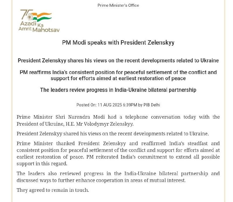 Indian PM Modi spoke with Zelensky on ‘recent developments’ in Ukraine India reaffirmed its call for a 'peaceful settlement' and 'restoration of peace' They also reviewed bilateral ties and agreed to 'remain in touch'
