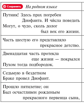 Диофант, дроби и уравнения❤️ В одной из книг по занимательной математике Якова Перельмана (в честь которого и назван этот канал) мне попалась краткая история Диофанта. Все, что известно о нем, почерпнуто из надписи на его гробнице. Надпись же составлена в форме математической задачи. Эту задачку я вам и приведу. Для решения нужно не бояться дробей, уметь составлять уравнения и решать их. Так что задачка для родителей и учеников 5-6 класса. Попробуйте сосчитать, сколько лет было Диофанту в разные периоды его жизни. Текст задачи — на скринах. Ответы приносите в комменты 🙃 А самым дерзким предлагаю и какую-нибудь свою историю загадочно запаковать в стихи! #средняяшкола #уравнения (С) Перельманцы: игровая и занимательная математика детям