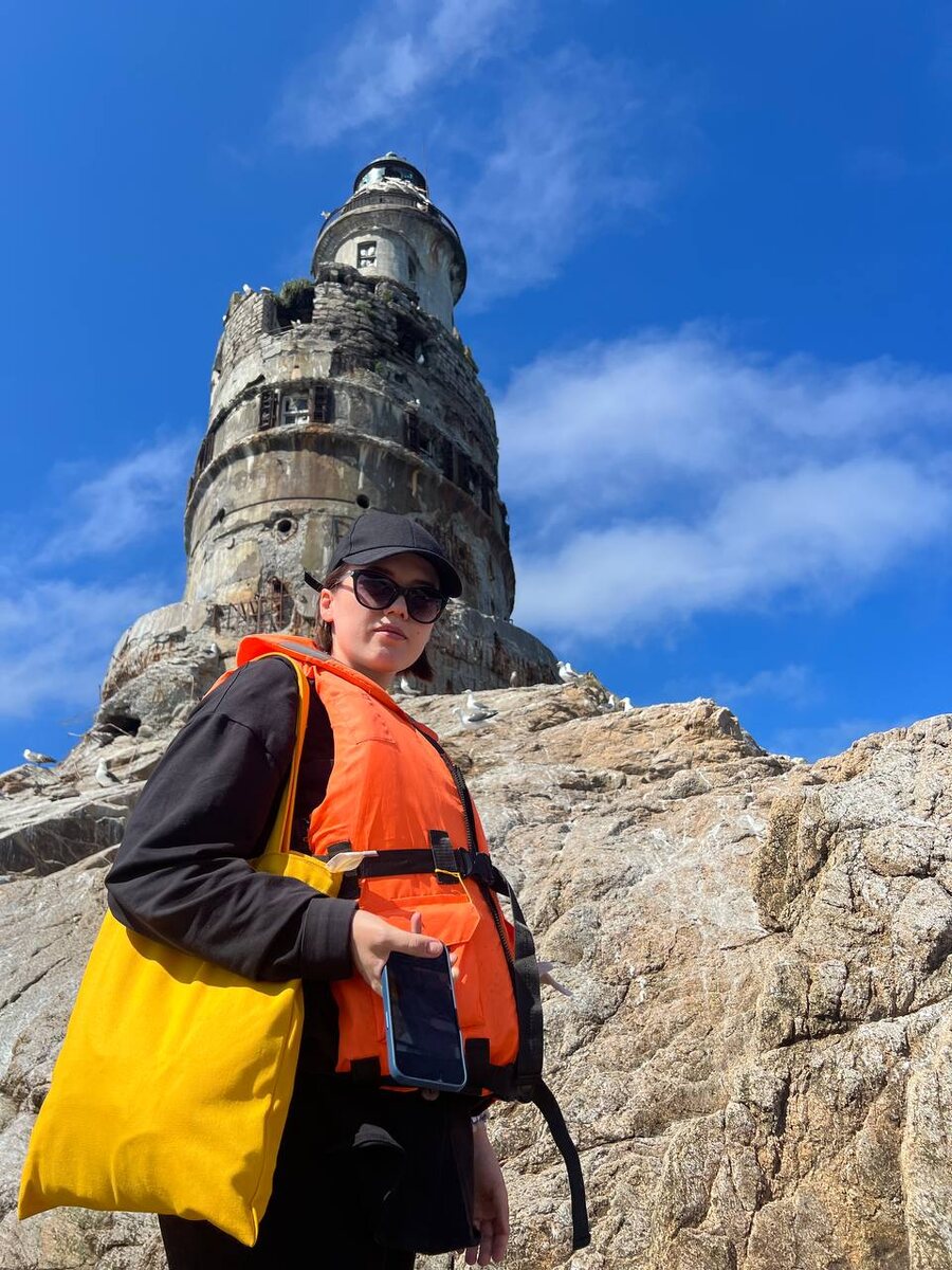 Знаете, какая у меня была мечта в 2021 году? Работать смотрителем маяка в Шотландии. Только представьте: тихо, уютно, за окном круглые сутки орут и гоняют бакланов чайки, в гости раз в месяц приплывают туристы и провиант — что ещё нужно интроверту? Только нормальная зарплата и вай-фай. У жизни были свои планы на меня, но даже ей не удалось вытурить маяки из моего сердечка. Поэтому, когда наш гид поинтересовался: «Кто хочет съездить на Аниву? Это маяк!», я стала первым самовыдвиженцем в нашей группе. А как иначе — это же маяк на острове маяков! И вот мы едем: три часа тряски на автобусе и катере туда, три обратно. Всё это ради каких-то полутора часов у маяка. Безумно? Идеально! Стоило нам сойти на берег, моя внутренняя фанючка истошно завопила от радости. Старый японский маяк, переживший войны, штормы и тучи туристов, возвышался перед нами, как гордый памятник инженерам-романтикам прошлого. Заброшенный, обветшалый, но всё ещё величественный - с него бы картины писать! Увы, ч