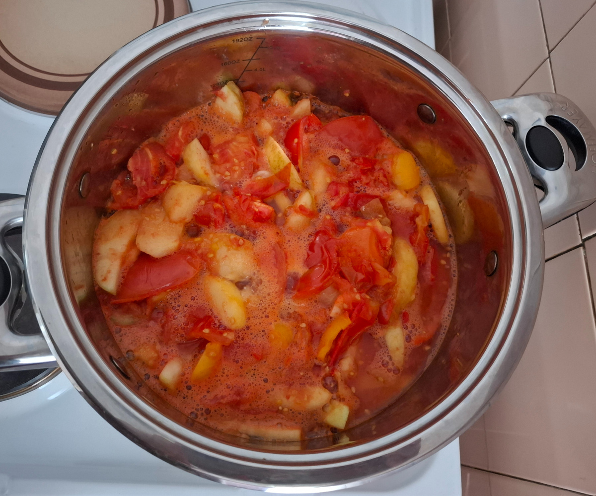 В Сети нашла простой рецепт домашнего кетчупа, приготовила, продегустировала - понравилось! Приготовление, действительно, несложное, почти как в шутке из фильма "Криминальное чтиво", когда папа-помидор случайно наступил на сына-помидорку и сказал: "Догоняй, кетчуп!" Ингредиенты Помидоры - 2 килограмма Яблоки - 250 граммов Сладкий перец - 1 штука Острый перец - 1 стручок Чеснок - 4 зубчика Все ингредиенты вымыть, очистить от семян, нарезать крупными кубиками и поместить в кастрюлю с толстым дном. Поставить на конфорку, довести до кипения, убавить интенсивность нагрева и варить до размягчения составляющих, периодически помешивая. Прямо в кастрюле измельчить блендером до однородной массы. Можно массу протереть через сито. Добавить к кетчупу: соль - 1 столовую ложку (без горки) сахарный песок - 6 столовых ложек уксус - 9% - 4 столовые ложки (75% - 1 чайная ложка) корица 1/2 чайной ложки паприка (можно копчёную) 1 столовая ложка лавровый лист - 4 штуки гвоздика - 4 штуки Кипятить на медленн