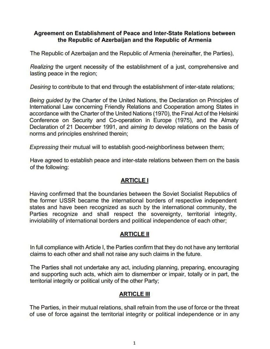 МИД Азербайджана опубликовал текст мирного соглашения между Ереваном и Баку, накануне парафированного в Вашингтоне. По нему стороны не имеют территориальных претензий друг к другу (Армения и Азербайджан 35 лет находятся в состоянии войны). Стороны подтверждают, что не имеют друг к другу территориальных претензий и не будут выдвигать такие претензии в будущем. Стороны не будут предпринимать никаких действий, включая планирование, подготовку, поощрение и поддержку таких действий, которые направлены на расчленение или подрыв, полностью или частично, территориальной целостности или политического единства другой Стороны. Всего документ состоит из 17 пунктов. В статье 7 указано, что стороны не будут размещать вдоль своей общей границы вооружённые силы третьих сторон.