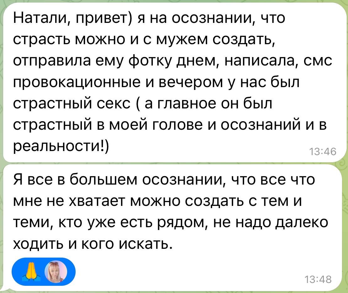 Теперь она смотрит на своего мужчину другими глазами. Видит в нём сильного и надёжного партнёра, а не «слишком хорошего». Чувствует к нему уважение, тепло и влечение. В отношениях появилась лёгкость и эмоциональная близость, а не вечные сомнения и дистанция. Если вы путаете спокойствие и надёжность с отсутствием страсти, из-за чего у вас не ладятся отношения, то вам точно нужно разбираться с глубокими подсознательными паттернами поведения. Кому отзывается такой результат и мой подход, пишите в л/с @Nataliya_M_Morozova