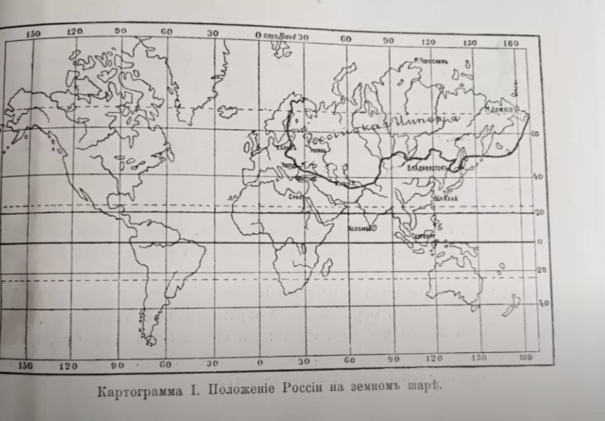 Учебник сообщает, что Российская империя занимала восточную часть Европы и северную и северо-западную Азию. По широте она простиралась почти на 42 градуса, по долготе — на 174, а расстояние с севера на юг доходило до 4,5 тысяч вёрст, с запада на восток — до 13 тысяч. Площадь превышала 400 тысяч квадратных миль, что составляло почти шестую часть всей суши Земли — крупнейшее государство планеты на тот момент.