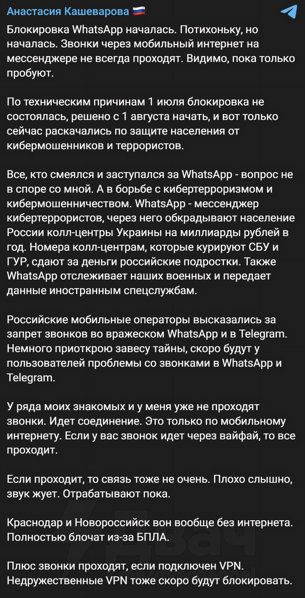 Блокировка WhatsApp уже началась, а следующей жертвой станут звонки в Telegram Рассказываем подробности: 🟠По словам близкой к властям журналистки Анастасии Кашеваровой, перебои со звонками через мобильный интернет – первые шаги РКН; 🟠Через Wi-Fi и VPN звонки пока работают; 🟠Операторы связи сами предложили запретить звонки в мессенджерах, чтобы вернуть пользователей на обычную связь, сократить мошенничество и снизить давление силовиков; 🟠Операторы жалуются на рост цен на оборудование и трафик, из-за чего интернет будет медленнее, особенно в крупных городах; 🟠На этом фоне вчера в Telegram случился массовый сбой – более 3000 жалоб за сутки, были недоступны аудио- и видеозвонки.