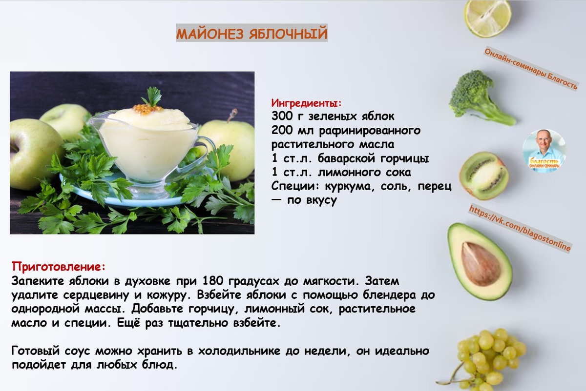 🍏 МАЙОНЕЗ ЯБЛОЧНЫЙ 🌀 Ингредиенты: 300 г зеленых яблок 200 мл рафинированного растительного масла 1 ст.л. баварской горчицы 1 ст.л. лимонного сока Специи: куркума, соль, перец — по вкусу 🌀 Приготовление: Запеките яблоки в духовке при 180 градусах до мягкости. Затем удалите сердцевину и кожуру. Взбейте яблоки с помощью блендера до однородной массы. Добавьте горчицу, лимонный сок, растительное масло и специи. Ещё раз тщательно взбейте. Готовый соус можно хранить в холодильнике до недели, он идеально подойдет для любых блюд.