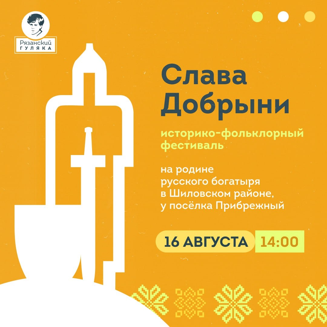 Ни дня без фестиваля 😝 В эти выходные приглашаем в Шиловский район. «Слава Добрыни» ждёт. Когда: 16 августа с 14:00 Где: у посёлка Прибрежный, стела Добрыни Никитичу Что будет: историко-фольклорный фестиваль 🛡 14:00 – театрализованное представление «Русские богатыри» с участием дружины ратоборцев «Русичи» Песенный фестиваль, аппетитные ряды, ярмарка мастеров, мастер-классы 🛡 17:00 – школа танцев «Губернский бал», мастер-класс по народным танцам 🛡 19:00 – выступление рэп-исполнителя Bllack-Santa 🛡 20:30 – заставный костёр – фолк-рок группа «Медведь» из Вологды А ещё во время фестиваля пройдёт богатырский забег. Участие в нём платное, есть дистанции от 5 до 50 километров! Если интересно и хотите почувствовать себя былинным героем – подробности тут. 🏃♂️ #гуляка_фестиваль 🤩 Рязанский гуляка