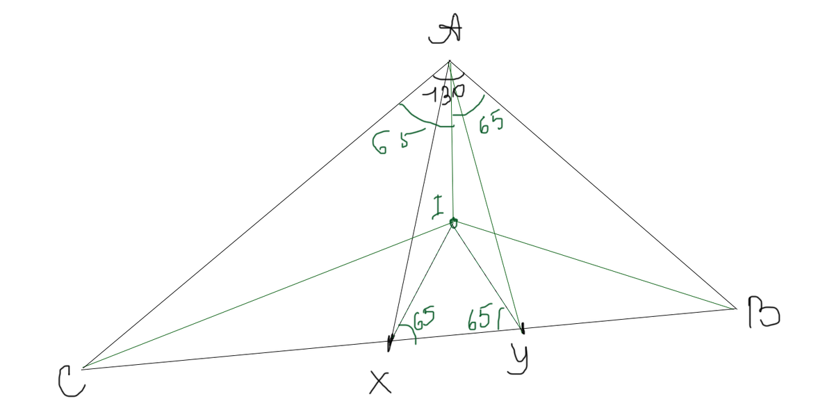 В треугольнике ABC угол A равен 130∘. На стороне BC выбраны точки X и Y такие, что AB=BX, AC=CY. Найдите угол XIY, где I — точка пересечения биссектрис треугольника ABC. Точка Х симметрична А oтносительно биссектрисы из угла В. Значит в треугольнике XIY угол Х=65 из симметрии. Точка Y симметрична А oтносительно биссектрисы из угла c. Значит в треугольнике XIY угол Y=65 из симметрии. 180-65*2=50 Ответ 50 B равнобедренном треугольнике ABC на боковой стороне BC отмечена точка M такая, что отрезок MC равен высоте треугольника, проведённой к этой стороне, а на боковой стороне AB отмечена точка K такая, что ∠KMC прямой. Известно, что ∠BCK=25∘. Найдите ∠BAC. Поскольку АВС равнобедренный, то АН легко отразить в СН'. СН'=СМ, СК общая, треугольники прямоугольные, значит они равны по катету и гипотенузе. В СН'В один угол 90, другой 50, значит третий 40. Значит углы при основании по 70. Ответ 70 Другие задачи раздела