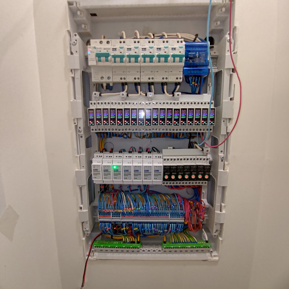 Вот такой щиток получился. Автоматика умный дом ZigBee. Все выводы выключателей и освещения собраны через клеммы в самом щите. Каждый автомат настраивается под нужный ампераж. Всё это умные цифровые устройства, в них в каждом есть автомат. Счётчик. РКН ... В верхнем ряду вводной автомат и 5 груп УЗО. Каждый автомат настраивается отдельно от 6 до 63 А все это внутри приложения, настройкой будет заниматься заказчик или его подопечные. Процесс сборки: От Виталия Кузнецова.