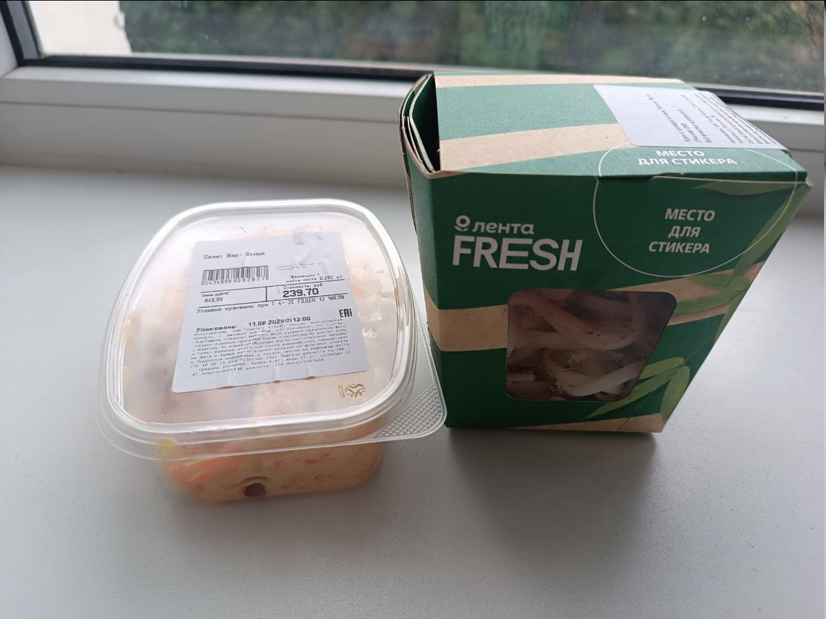 В огромном гипермаркете выбрать что-то на 400 рублей та ещё задача, глаза разбегаются, не знаешь, что взять. Но раз уж это баллы не Магнита с Пятёрочкой, то я решила взять готовую еду – мой любимый салат из Ленты "Жар-птица" с маринованными опятами и удон с курицей в соусе Терияки. Удон неплохой, а салат идеальный.