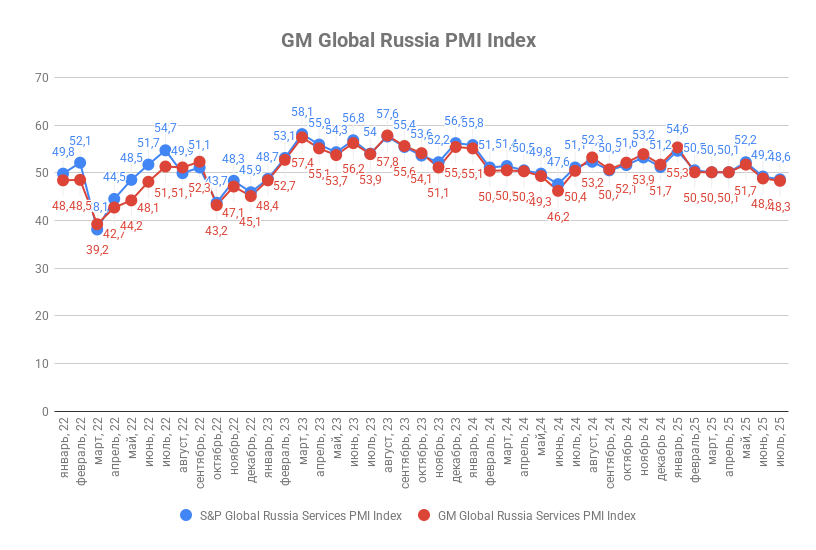 Июль 2025 года ознаменовался дальнейшим снижением ключевых индикаторов деловой активности в сфере услуг России. Индекс GM Global Services Russia PMI Index зафиксирован на уровне 48,3 п.п., что ниже июньского значения в 48,8 п.п. Параллельно индекс S&P Global Russia Services PMI снизился с 49,2 п.п. до 48,6 п.п.