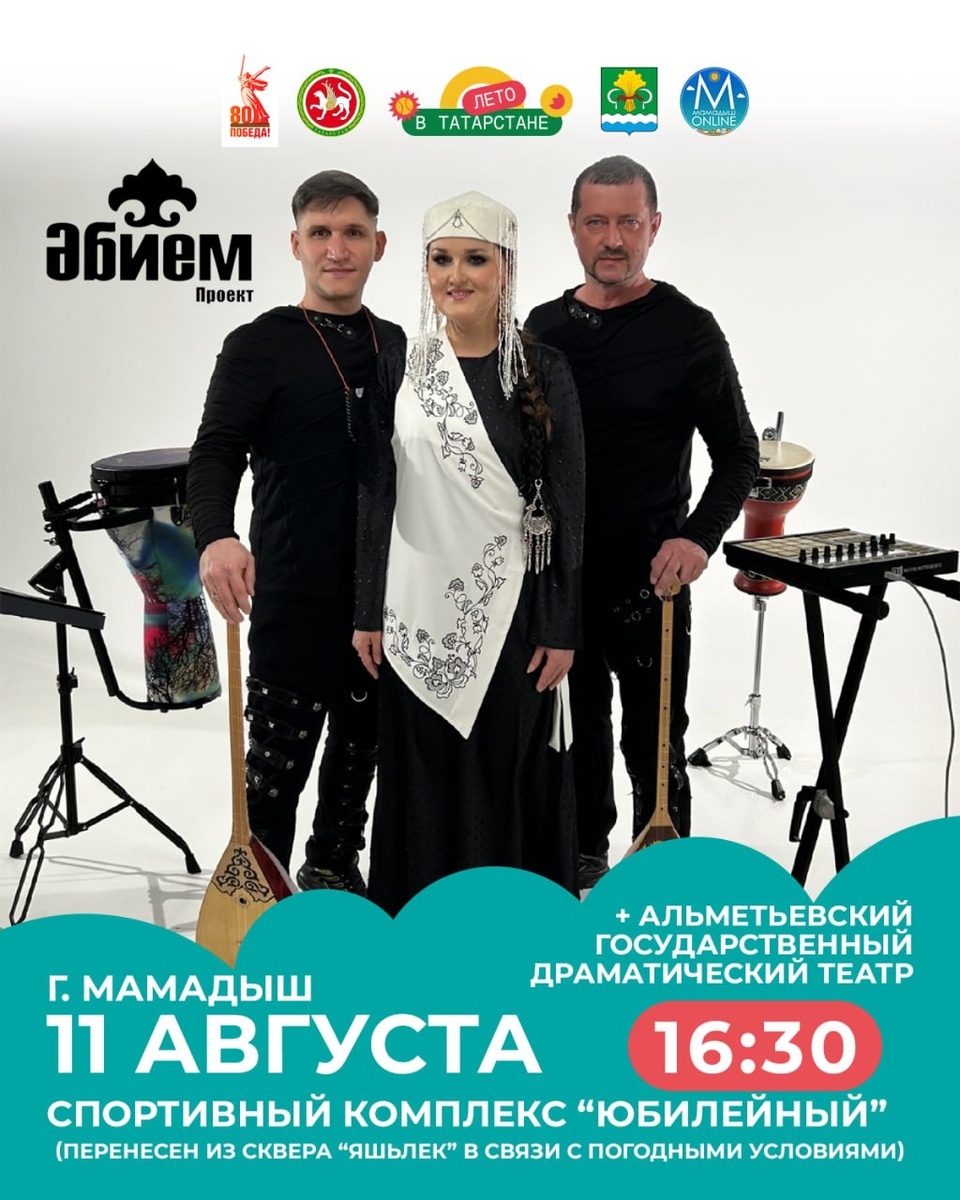 ❗️ Место проведение перенесено. Артисты эксклюзивного проекта «Эбием» и Альметьевского государственного драматического театра выступят в Мамадыше в рамках фестиваля добрососедства. 11 августа, 16:30 час, Спортивный комплекс "Юбилейный" (Перенесен из сквера “Яшьлек” в связи с погодными условиями). Не пропусти 6+ ✅ ПОДПИСАТЬСЯ l ПРИСЛАТЬ НОВОСТЬ