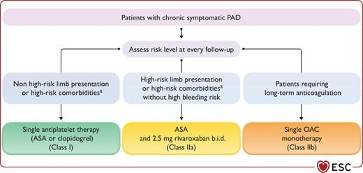 Оптимальное управление лекарственной терапией при заболеваниях периферических артерий. 1️⃣При симптоматических заболеваниях периферических артерий рекомендуется монотерапия антиагрегантами (аспирином или клопидогрелом); 2️⃣При высоком ишемическом риске* и низком риске кровотечений — двойная терапия (ривароксабан 2,5 мг 2 раза и аспирин). 3️⃣При заболеваниях аорты (аневризмы и расслоения аорты) бета-блокаторы и иАПФ снижают нагрузку на стенки аорты и замедляют прогрессирование аневризмы. * - перенесенная ампутация, хроническая ишемия, угрожающая конечностям, предыдущая реваскуляризация или сопутствующие заболевания: сердечная недостаточность, сахарный диабет, заболевания сосудов 2-х бассейнов, рСКФ <60 мл/мин/1,73 м2. @sinkevich_cardio